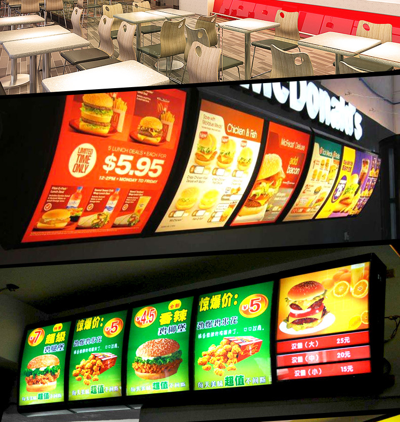 點(diǎn)餐燈箱,就是方便來(lái)客人的時(shí)候可以看著點(diǎn)餐燈箱上面的餐飲食物來(lái)點(diǎn)餐,般這種燈箱在肯德基、麥當(dāng)勞、必勝客這些連鎖店里出現(xiàn)的多。